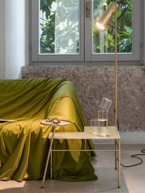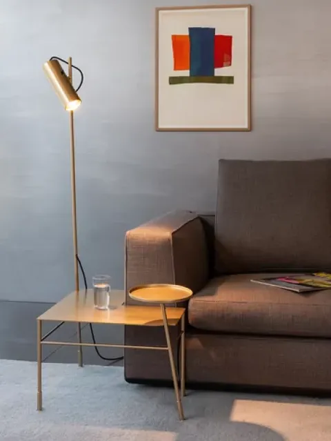 Die Trilogie aus Leuchte, Tablett und Tisch trägt den Namen Dase’. Das Tisch-Ensemble ist in jedem Fall ein Hingucker – nicht nur wegen seines edlen goldfarbenen oder schwarzen Looks und des aparten Designs. Der einzigartige Beistelltisch Dase’ ist äußerst praktisch zugleich. Der in Dreiecksform konzipierte Coffee Table ist aus Metall gefertigt und vereint in sich verschiedene Funktionen: die offensichtlichen sind die einer Leuchte, eines kleinen Tabletts für Drink, Mobiltelefon oder Snack sowie die eines Beistelltisches, der sich exakt um die Ecke eines Sofas oder Sessels schmiegt. Weitere Nutzungen des filigranen Beistelltisches Dase’ bleiben Ihrem Ideenreichtum überlassen. Mit seiner – trotz Mehrfunktionalität – schlicht eleganten Formensprache hat Dase’ das Potenzial zum Design-Klassiker zu avancieren.