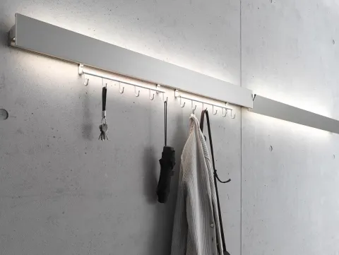 Die LED-Garderobenleuchte GL 8 aus der Produktgruppe Gera Lichtsystem 8 ist eine eindrucksvolle Lösung zur Beleuchtung von Fluren und Eingangsbereichen. Suchen Sie eine Garderobe mit Leuchte oder eine Wandleuchte mit Garderobe? Für beides ist die LED-Garderobenleuchte GL 8 die Lösung. Mittels einer verstellbaren Metallblende lassen sich Lichtrichtung und beleuchtete Flächen variieren. Separat bestellbare Garderobenhakenleisten können in eine hinter der Gera Leuchten Flurleuchte angebrachten Schiene eingehängt werden. Dort lassen sie sich einfach verschieben und immer wieder neu platzieren. So entsteht auf kleinstem Raum eine belastbare Garderobe mit interessanten Lichteffekten, die auch als dezenter Blickfang fungiert, der Design und Funktion harmonisch zusammenführt. Die LED-Garderobenleuchte GL 8 eignet sich einerseits ideal für kleine Nischen, andererseits führt die Addition mehrerer Leuchten zu imposanten linear fluchtenden Raumgestaltungen in längeren Korridoren.