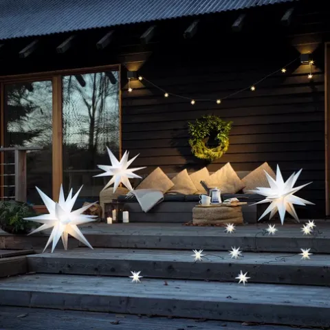 Für Sternstunden zur Weihnachtszeit stehen gleich zwei LED-Leuchtsterne bereit – drinnen wie draußen. Der elfzackige Weihnachtsstern ist zum Aufhängen gedacht. Mit seinen 18 Zacken setzt der Jumbo Weihnachtsstern überall sein Ambiente glanzvoll in Szene – ob auf einem Sockel oder einem Tisch, auf Treppenstufen oder der Veranda, im Entrée oder im Wohnzimmer. Die grandiosen Weihnachtssterne erhellen auf wunderbare Weise lange Winterabende.