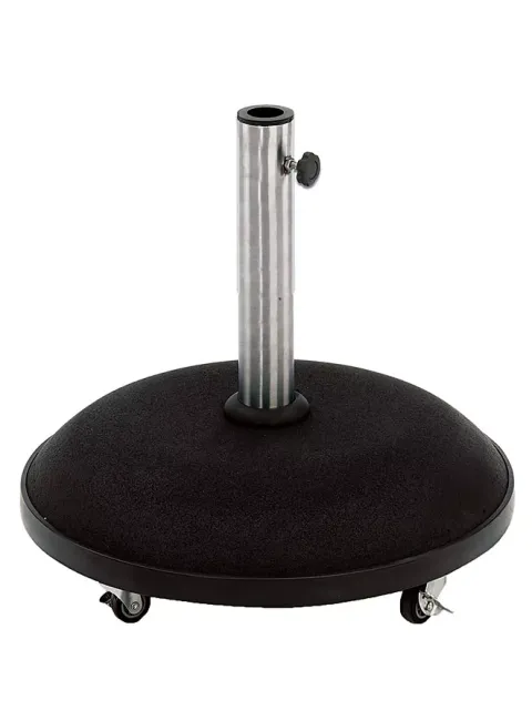 Der aus Beton gefertigte Sonnenschirmständer mit Rollen verleiht mit seinen 35 Kilogramm Gewicht einen festen Stand. Er passt für Stockstärken von 35, 38 und 48 Millimetern.