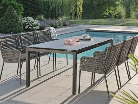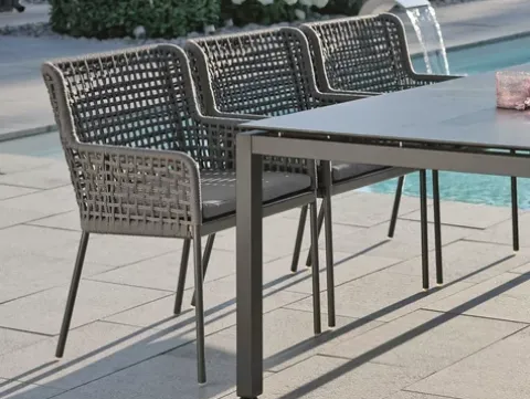 Das ideale Sitzmöbel für ein langes Abendessen im Freien! Der Diningsessel Greta besticht optisch mit einem zierlichen Gestell und einer faszinierenden Bespannung, die sich als überaus angenehm und bequem erweist. Die Bespannung in Kordel-Optik besteht aus 100% Polypropylen, einer Synthetikfaser, die besonders scheuerfest ist und nahezu keine Feuchtigkeit aufnimmt. Damit hat dieses Material neben seinem hohen Komfort höchste Tauglichkeit für den Außenbereich. Der Bezug der zugehörigen Kissen ist mit einem Reißverschluss versehen und lässt sich dank diesem zum Zwecke der Reinigung (30°C Feinwäsche) leicht und einfach abnehmen.