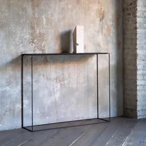 Die Konsole Slim Irony hält, was ihr Name verspricht. Sie ist so minimalistisch schlank, dass sie fast wie eine Zeichnung mit der Wand zu verschmelzen scheint. Dennoch bietet sie auf der nahezu schwebend anmutenden Horizontalen eine solide Ablagefläche. Die kubische Form vereint vollendete italienische Eleganz mit industrieller Ästhetik und macht Slim Ivory zu einem zeitlosen Möbel, das sich besonders gut in modernes Ambiente einfügt – oder anderswo einen puristischen Akzent setzt. Die hohe Material- und Verarbeitungsqualität von Zeus prädestiniert die Konsole für intensive Nutzung. Das Gestell aus robustem Vierkantstahlrohr mit Epoxidharzlackierung zeichnet sich durch hohe Stabilität und Standfestigkeit aus.