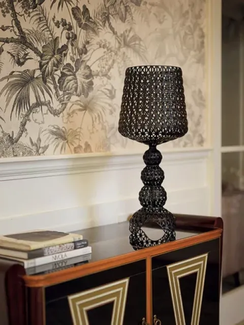 Die LED-Tischleuchte Mini Kabuki des berühmten Designers Ferruccio Laviani (*1960) für den nicht weniger berühmten Hersteller Kartell ist eine wohlproportionierte Lichtquelle von harmonischer Abmessung und der formalen Andeutung eines Weinglases, in dessen Stiel großformatige Stilperlen eingearbeitet sind. Die Mini Kabuki verfügt über einen integrierten Dimmer, aber das technisch Besondere an dieser Leuchte ist ihre Herstellungsweise. Die LED-Tischleuchte Mini Kabuki entsteht nämlich im Spritzgussverfahren. Nur auf diese Art ist es möglich, die perforierte Oberfläche der Leuchte zu schaffen. Die außergewöhnliche Beschaffenheit des Materials bringt eine charaktervolle Lichtstreuung mit sich. Der Name Mini Kabuki geht zurück auf das japanische Theater der frühen Neuzeit und bedeutet im Deutschen so viel wie „Gesang und Tanz“. Der Name ist Programm, denn wenn Sie die LED-Tischleuchte Mini Kabuki einschalten, dann tanzen die Photonen!