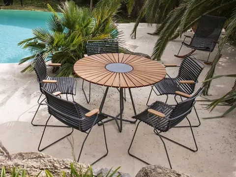 Der Circle von Henrik Pedersen für den beliebten dänischen Gartenmöbel-Hersteller Houe ist ein bildhübscher Tisch für den Außenbereich. Auffallendes ästhetisches Merkmal dieses markanten Houe-Möbels ist die Tischplatte, die als großes dekoratives Rundelement ins Auge sticht. Vom Mittelpunkt der Platte aus gegossenem Granit strahlen qualitätsvolle Bambuselemente rosettenförmig nach außen ab. Diese form- und materialschöne Tischplatte ruht auf einem nicht minder schmucken, fünfgliedrigen und qualitätsvollen Aluminiumgestell. Der hochwertigen Verarbeitung und der wunderschönen Materialkombination wegen ist der Gartentisch Circle von Houe seinen Preis wert!
