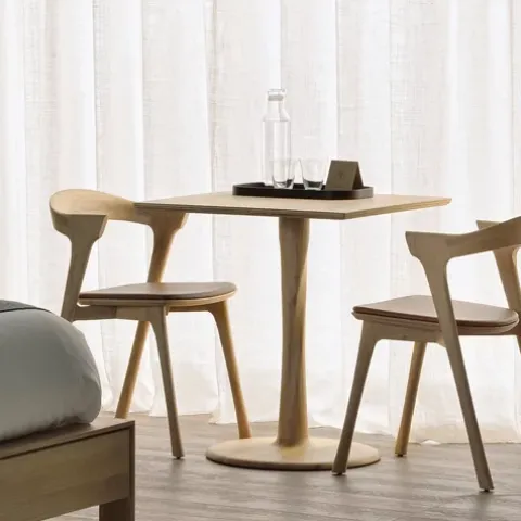 Ob mit runder oder quadratischer Tischplatte – Torsion bildet eine Symbiose aus klassischer Ästhetik, modernem Look und Nachhaltigkeit. Der Designer Alain van Havre wählte für alle Teile des Tisches hochwertiges Eichenholz. Aus diesem schuf er skulpturale Formen mit torsadenförmigen Elementen, die den beiden Tischvarianten neben der warmen Ausstrahlung des fein gemaserten Holzes besondere Raffinesse und Eleganz verleihen. Torsion wird so zu einem „natürlichen“ Klassiker der besonderen Art.