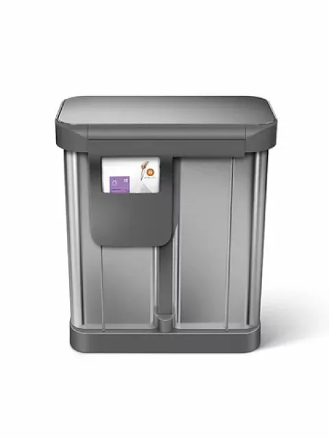 Ein Treteimer aus gebürstetem Edelstahl, ordentlich und sicher: dieses Doppelfach-Behältnis fasst ca. 58 Liter; eine der zwei Kammern ist mit einem Henkeleimer ausgestattet. Die zwei Fächer des Eimers vereinfachen das Sortieren Ihres Mülls und Ihrer Wertstoffe erheblich. Eines der zwei Fächer verfügt über ein innovatives ‚Beutelfach‘, welches die Müllbeutel aufbewahrt und ein einfaches Wechseln der Beutel ermöglicht. Passende Müllbeutel können nachbestellt werden. Dank einer transparenten Nanosilberbeschichtung ist der Eimer resistent gegen Fingerabdrücke und Keime.