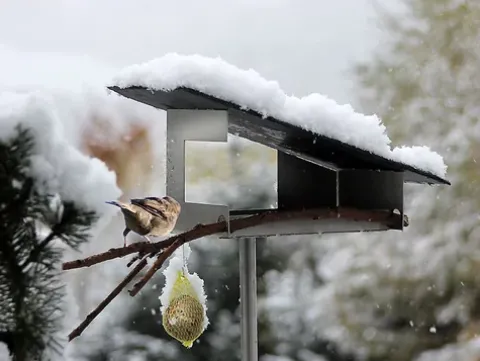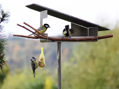 Im Winter sind Vögel auf die Zufütterung durch Menschen angewiesen – wie mit diesem Vogelimbiss. Das Vogelfutterhaus besteht aus einem Schrägdach aus echtem Schiefer und steht auf einer stabilen Edelstahlstange. Es verfügt über Löcher, in die als Landehilfe ein Ast gesteckt werden oder ein Meisenknödel gehängt werden kann. Die Materialien sind allesamt rostfrei.