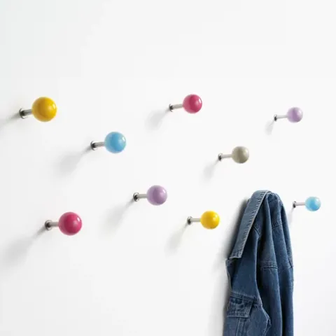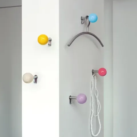 Wenn der Haken eine Kugel ist, ist Dots im Spiel. An Ihrer Wand eröffnen die lackierten Massivholzkugeln eine einladende Symphonie für Mäntel, Jacken, Schirme, Schals und Hüte. Schaft und Wandscheibe aus gebürstetem Edelstahl verankern sie fest in der Wand. Ob Sie eine Tonleiter oder gerade Linien damit gestalten, bleibt Ihnen überlassen. Ästhetisch den Ton angebend sind die Dots in jedem Fall.